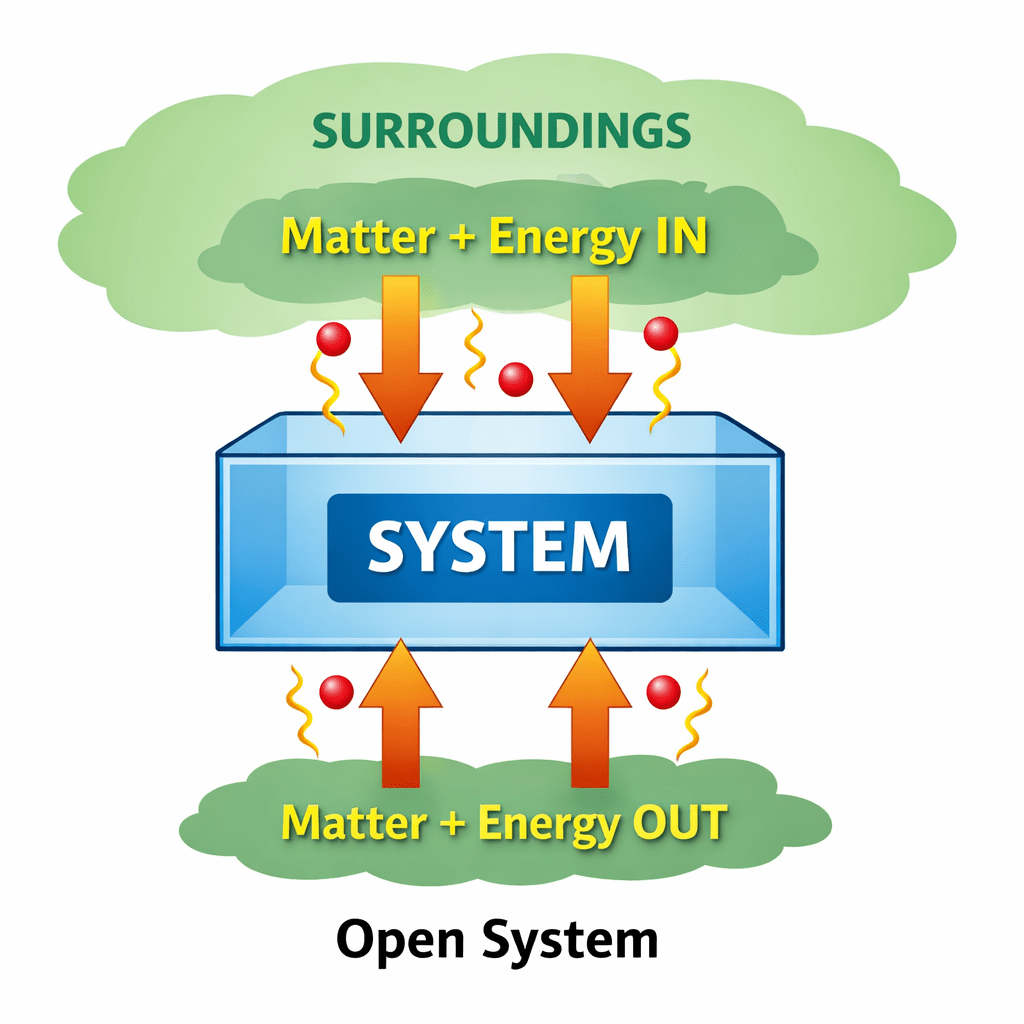 The type of system in which both matter and energy is exchanged between system and surroundings.