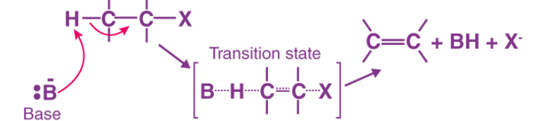 - Proton removal, double bond formation, and leaving group departure occur simultaneously.