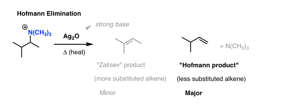The Hofmann elimination is the preparation of alkenes from the treatment of quaternary ammonium salts with silver oxide, water, and heat.