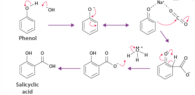 Phenol + NaOH + CO₂ (pressure, heat) → o-hydroxybenzoic acid (salicylic acid)