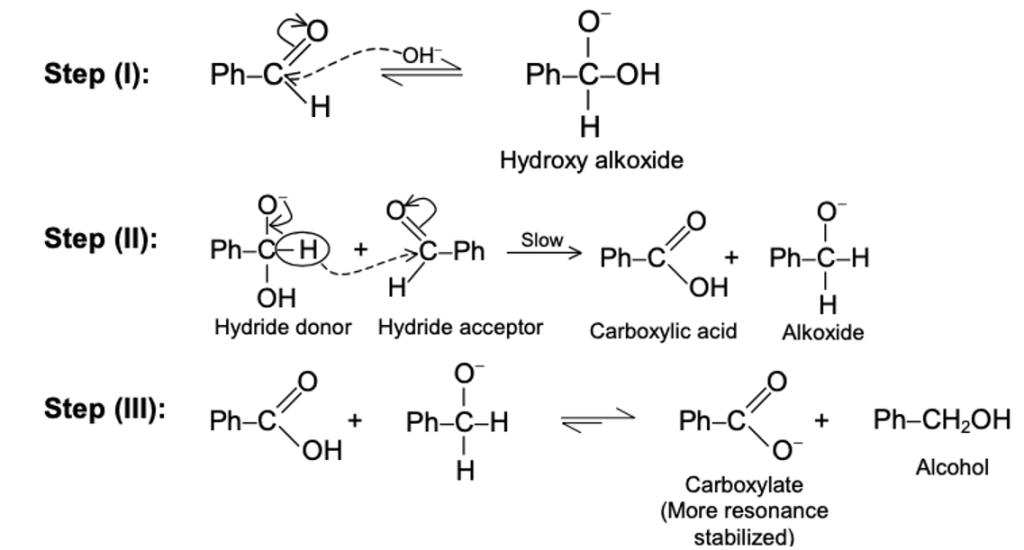 - Nucleophilic attack of OH⁻ on aldehyde → alkoxide intermediate