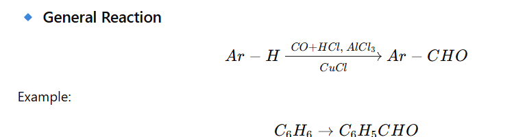 Gattermann–Koch introduces –CHO on benzene via formyl cation (HCO⁺) using CO + HCl / AlCl₃–CuCl