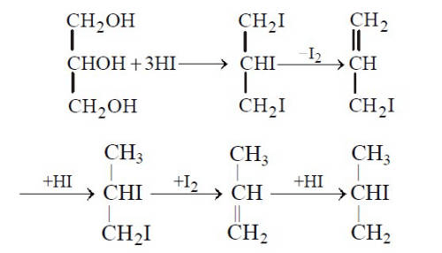 Glycerol + excess HI → 2-iodopropane (isopropyl iodide) + I₂ + H₂O