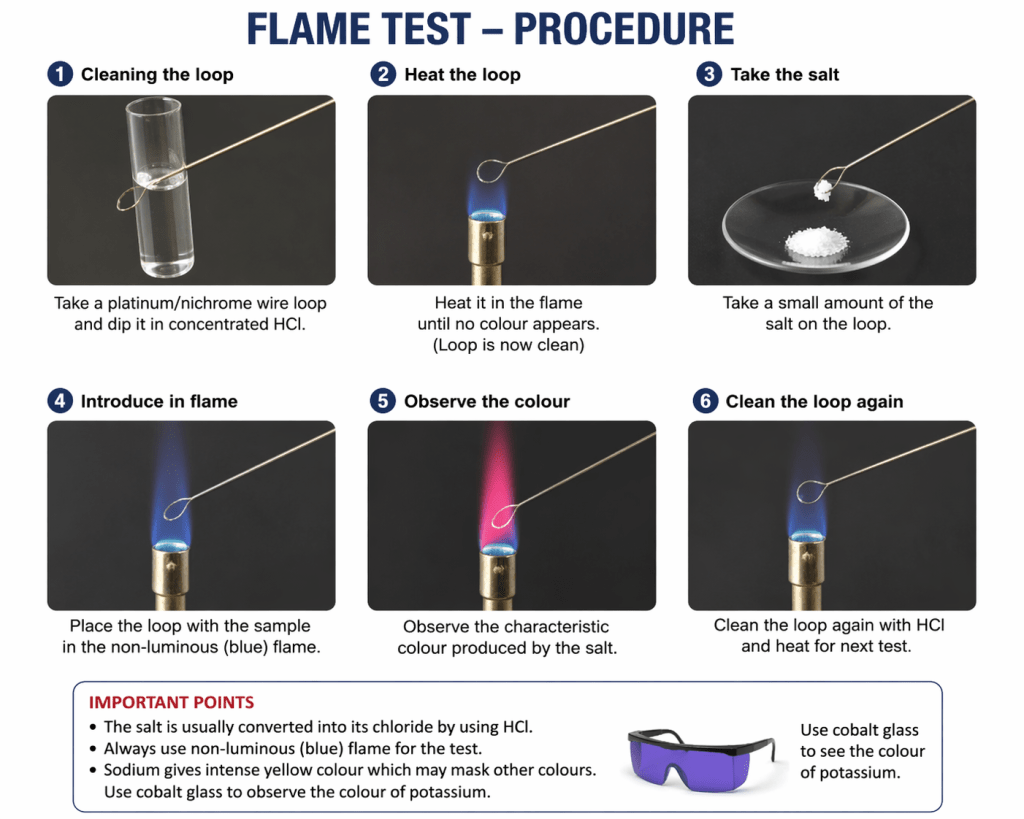 In qualitative analysis, dry tests are performed without dissolving the salt in solution. In a flame test, the salt (usually converted to its chloride) is directly heated in a flame, so it falls under dry tests. Flame test is done by heating a salt (on a clean wire loop with HCl) in a non-luminous flame and observing the characteristic color.