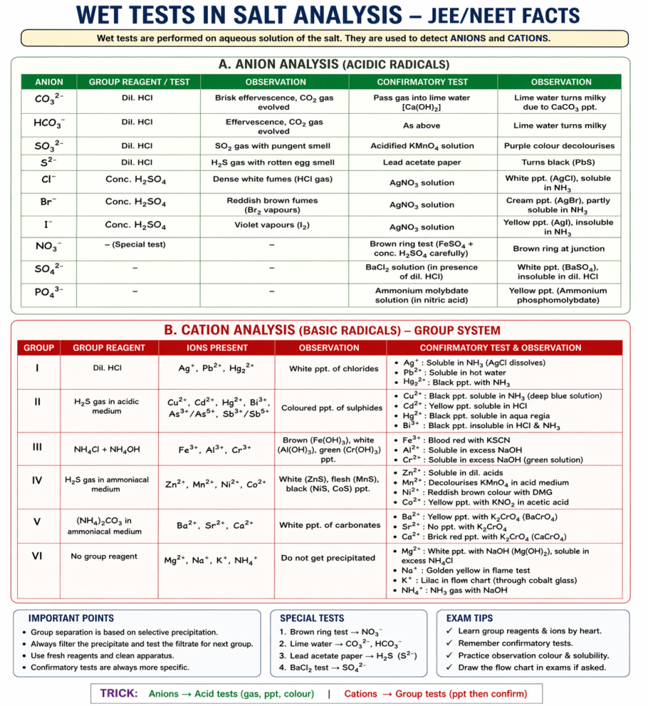 A wet test is a method in salt analysis where the substance is first dissolved in a solvent (usually water or acid) and then tested using chemical reactions.