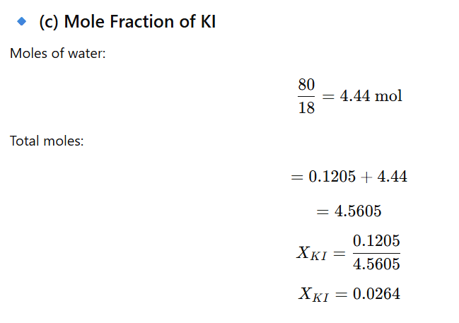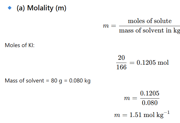1.5 Calculate (a) molality (b) molarity and (c) mole fraction of KI if the density