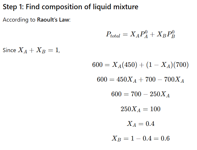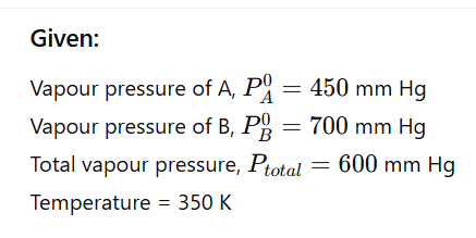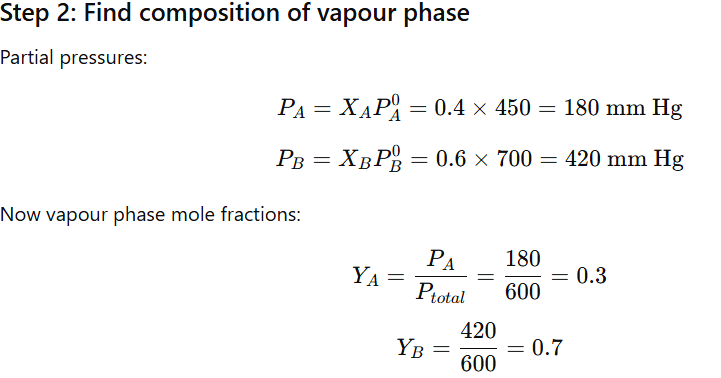 vapour pressure is 600 mm Hg. Also find the composition of the vapour phase.