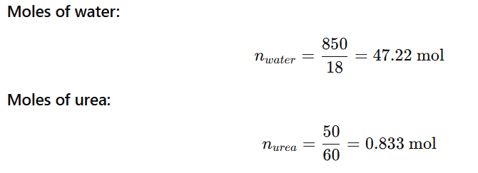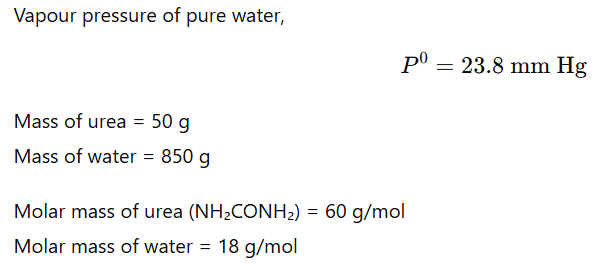1.9 Vapour pressure of pure water at 298 K is 23.8 mm Hg. 50 g of urea (NH2CONH2) is dissolved in 850 g of water. Calculate the vapour pressure of water for this solution and its relative lowering.