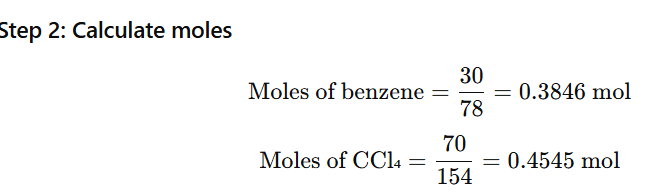 - Mass of carbon tetrachloride (CCl₄) = 70 g