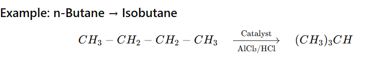 Isomerisation of alkane is the process in which a straight-chain alkane (n-alkane) is converted into its branched-chain isomer without changing the molecular formula.